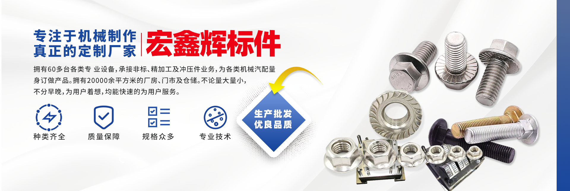 四川宏鑫輝標(biāo)準(zhǔn)件制造有限公司下設(shè):南充市宏輝機(jī)械制造有限公司,南充市聚宏機(jī)電設(shè)備有限公司,公司始建于1994年。為了拓展市場,降低成本,本公司于2007年、2020年分別在南充、 成都、重慶創(chuàng)建了生產(chǎn)基地。擁有60多臺(tái)各類專 業(yè)設(shè)備,承接非標(biāo)、精加工及沖壓件業(yè)務(wù),為各 類機(jī)械汽配量身訂做產(chǎn)品。擁有20000余平方米的廠房、門市及倉儲(chǔ)。公司以誠信為本,竭誠為廣大客戶提供服務(wù)。不論量大量小,不分早晚,為用戶著想,均能快速的為用戶服務(wù)。 公司所生產(chǎn)及代理的產(chǎn)品為業(yè)界人士公認(rèn)的國內(nèi)、國際優(yōu)等品牌。在產(chǎn)品性能與質(zhì)量